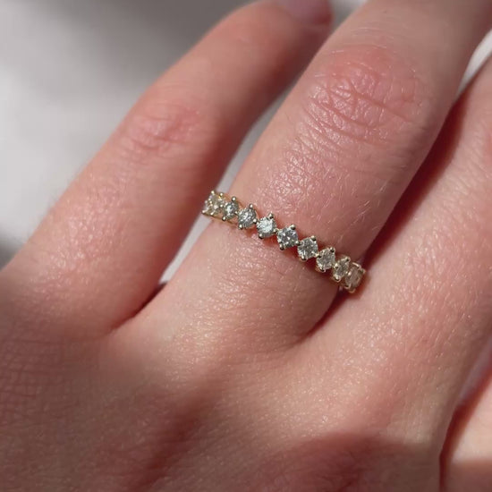 The Diamond Daylight Ring features round diamonds that are meticulously set in a delicate shared claw setting, creating a ring that's both contemporary and versatile. Designed to complement your engagement and anniversary rings, it also makes a stunning statement on its own.