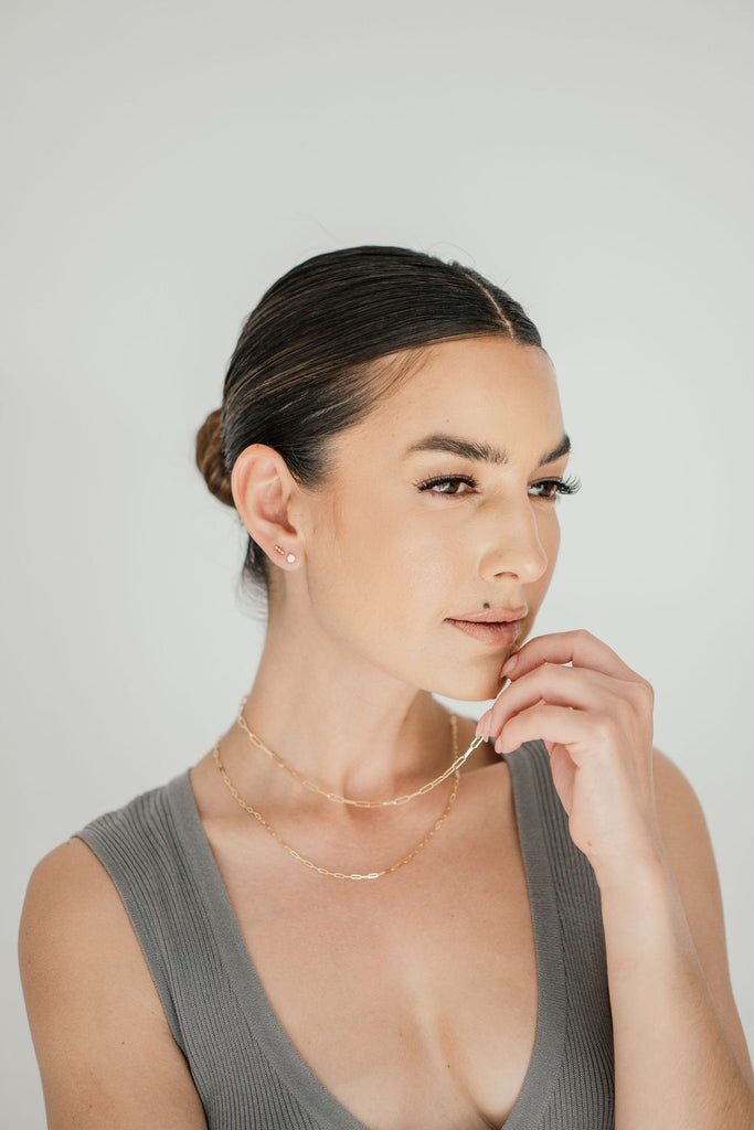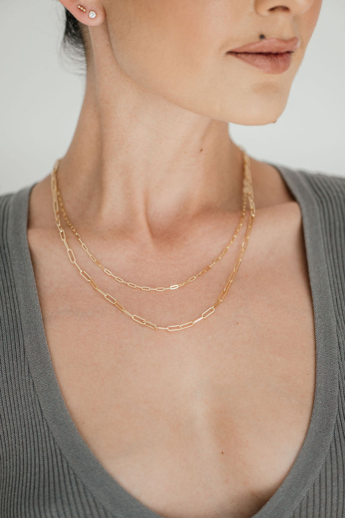 Image: 9ct yellow gold (45cm) layered with The Marquise Diamond Necklace, (42cm) and The Bold Paperclip Chain (50cm).